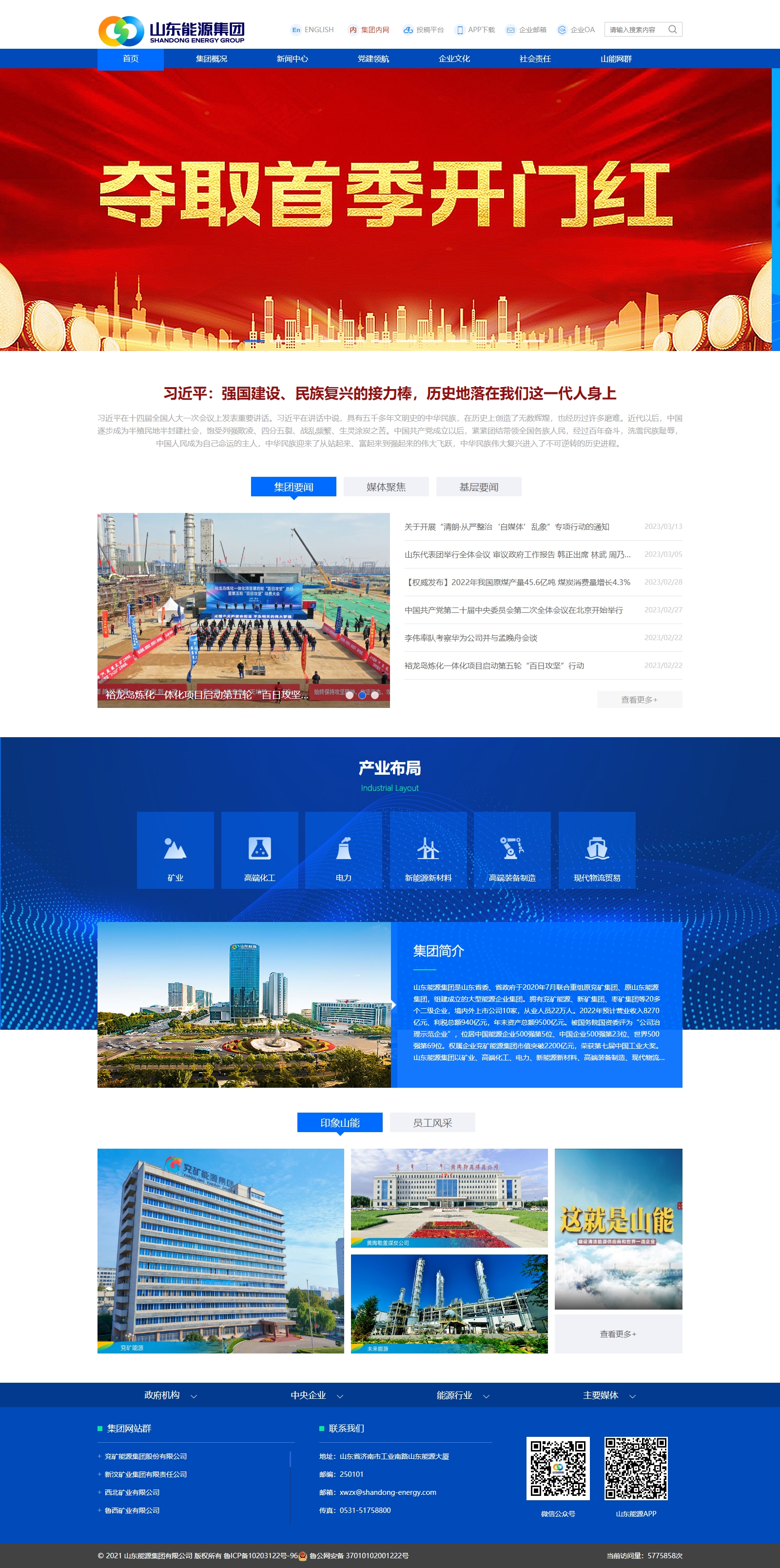 山东能源集团是山东省委、省政府于2020年7月联合重组原兖矿集团、原山东能源集团,组建成立的大型能源企业集团。拥有兖矿能源、新矿集团、枣矿集团等20多个二级企业,境内外上市公司10家,从业人员22万人。2022年预计营业收入8270亿元、利税总额940亿元,年末资产总额9500亿元。被国务院国资委评为“公司治理示范企业”,位居中国能源企业500强第5位、中国企业500强第23位、世界500强第69位。权属企业兖矿能源集团市值突破2200亿元,荣获第七届中国工业大奖。